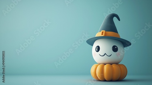 Cute ghost pumpkin figurine wearing witch hat. Concept of Halloween, fall, spooky, holiday, and whimsical decor