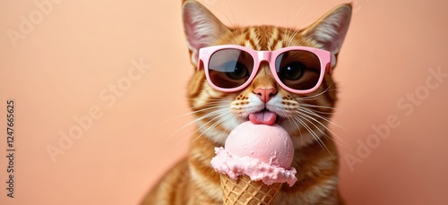 Cute ginger cat wears pink sunglasses, enjoys pink ice cream cone. Funny cat eats ice cream. Summer fun. Adorable pet. Perfect for social media pet product ads. Great summer photo. Animals, food.