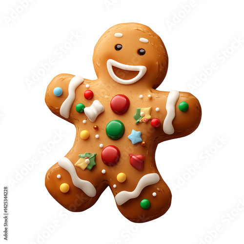 Cute gingerbread man cookie with smiling face icing decorations and candy buttons traditional Christmas treat isolated on transparent background isolated white background