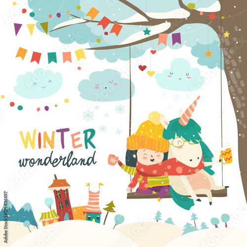 Cute girl and unicorn swinging in winter park. Vector greeting card