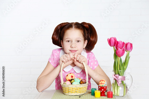 Cute girl decorates Easter eggs, on light background