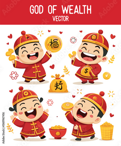 Cute God of Wealth Emoji Vector - Fortune Chinese Deity Kawaii Style for Lunar New Year