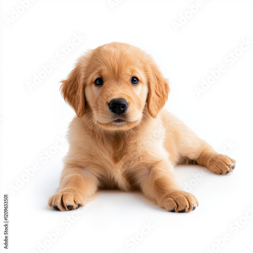 puppy, golden retriever, dog, cute, curious, lying, pet, animal, fluffy, adorable, young, canino, fur, playful, innocent, eye, ear, paw, domestic, mammal, breed, friendly, loyal, companion, family, soft, gentle, lovable, sweet, charming, portrait, white background, relaxed, calm, serene