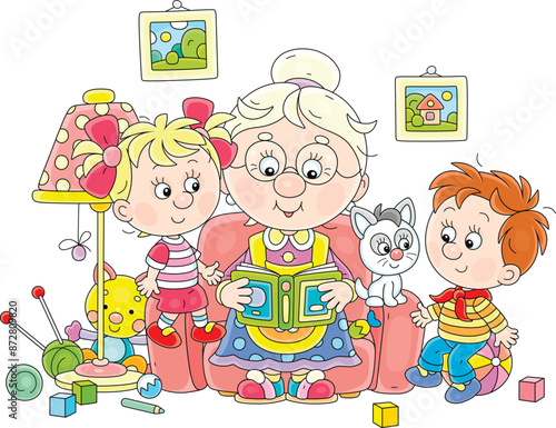 Cute grandma reading aloud an interesting fairy tale book to her happy little grandson and granddaughter, vector cartoon illustration on a white background