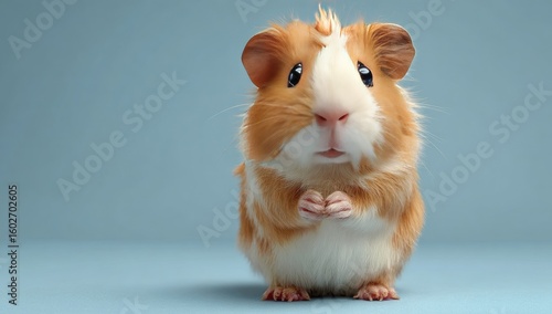 guinea, pig, cute, small, animal, pet, rodent, adorable, fluffy, orange, white, studio, light, background, portrait, front, paw, expression, surprised, calm, gentle, hair, ear, face, nose, eye, digital, rendered, closeup, warm, soft, mammal, charming, fuzzy, looking, smiling, standing
