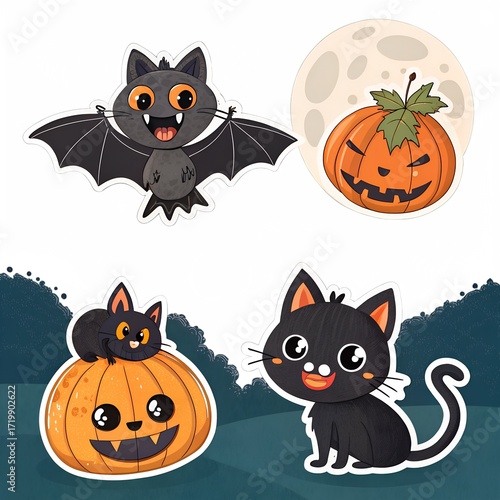 halloween, cat, pumpkin, set, bat, animal, holiday, horror, autumn, collection, animal, sticker, skittish, cartoon, character, vector, illustration, vampire, moon, scarey, black cat, friendly, fun, children, celebration, party, trick or treat, seasonal, october, festive, decoration, design, element, isolated, background, night, creature, ghost, icon, cute, sorcerer, symbol, hat, spider, dog