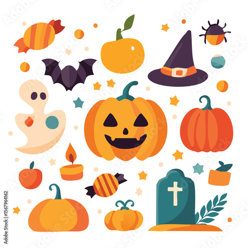 Cute Halloween Clipart Set – Flat Design of Spooky Items in Doodle Style. Minimalist Halloween Vector Icons – Flat Doodle Style Pumpkins, Ghosts, Rats, and Tombstones