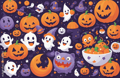 cute halloween festival illustration pattern background cartoon with ghost and pumpkin