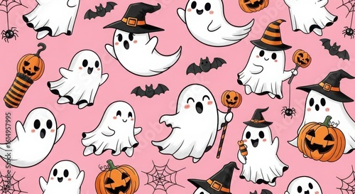halloween, ghost, cute, skittish, sorcerer, hat, pumpkin, bat, spider, web, pattern, illustration, cartoon, character, fun, holiday, celebration, seasonal, fall, autumn, pink, background, design, vector, drawing, whimsical, friendly, trick, or, treat