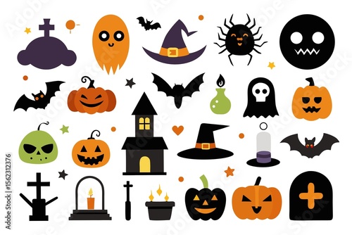 Cute Halloween Icons: Flat Design, Spooky and Playful Pumpkins, Bats, Ghosts, Witches' Hats, and More.