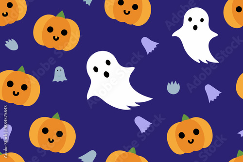 halloween, pattern, background, ghost, pumpkin, cute, cartoon, illustration, skittish, seasonal, holiday, fall, autumn, orange, white, blue, purple, dark, festive, celebration, vector, graphic, design, art, digital, simple, minimalist, playful, whimsical, friendly, scarey, children, children, party, decor, textile, fabric, wallpaper, scrapbook, invitation, card, wrapping paper, seamless, repeat