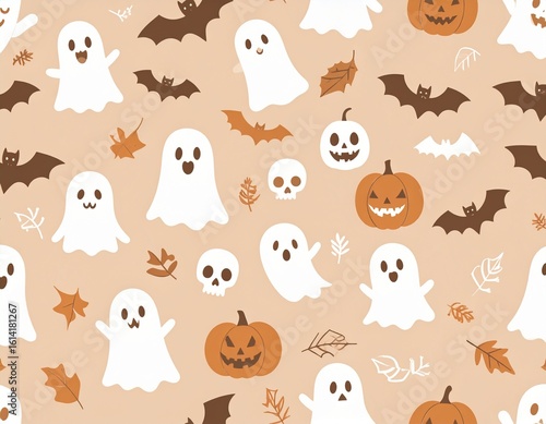 Cute halloween pattern with ghosts bats pumpkins skulls and autumn leaves seamless fall background wallpaper