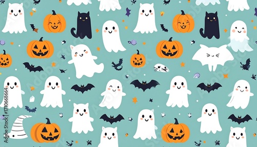 Cute Halloween pattern with ghosts, pumpkins, and cats