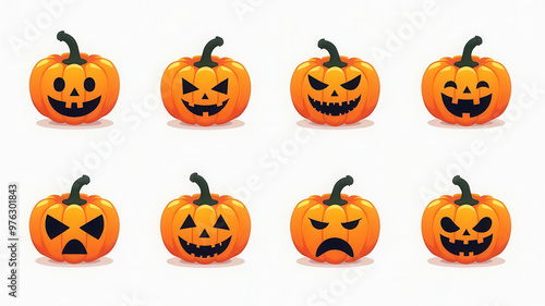 pumpkin, carved, isolated, white, white background, on white, copy space, set, collection, many, group, cute, variety, halloween, november, october, season, seasonal, holiday, tradition, traditional, us, autumn, fall, america, american, magic, fantasy, skittish, fairy tale, witchcraft, lantern, face, grin, smile, angry, evil, design, illustration, comic, art, orange, scarey, decoration, jack, fun, vegetable, cartoon