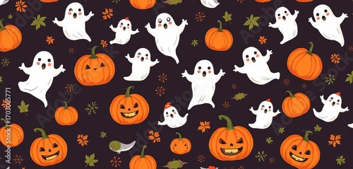 Cute Halloween seamless pattern featuring ghosts, pumpkins, and autumnal elements A spooky yet charming design ideal for backgrounds and textiles, cute, spooky