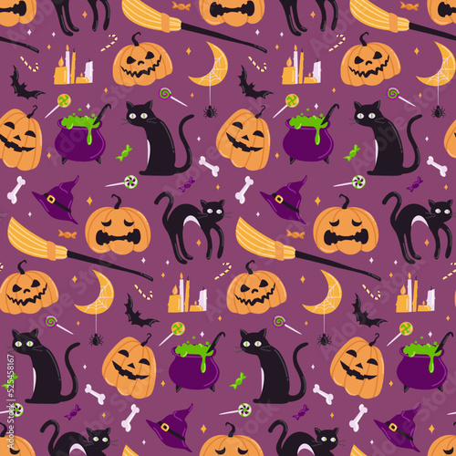 seamless, pattern, halloween, pumpkin, cat, vector, background, decoration, holiday, creepy, october, black, autumn, spider, illustration, cartoon, ghost, bat, texture, skull, design, horror, sorcerer, skittish, scarey, hat, wallpaper, night, symbol, childish, paper, trick, print, drawing, orange, magic, trick or treat, decor, silhouette, colourful, wrapping, candy, celebration, fun, cute, seamless pattern, isolated
