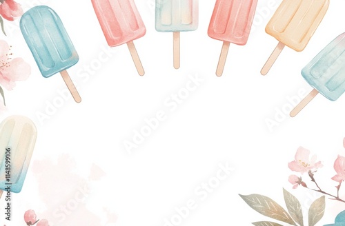 Cute hand-drawn ice cream background with watercolor effect and pastel colors, featuring popsicles in a vertical line, cherry tree leaves