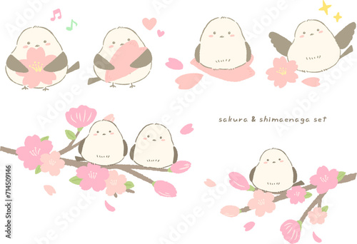 Cute hand-drawn illustration set of cherry blossoms and Shimaenaga(Long-tailed tit) with petals / 桜と花びらを持ったシマエナガ、かわいい手描きイラストセット