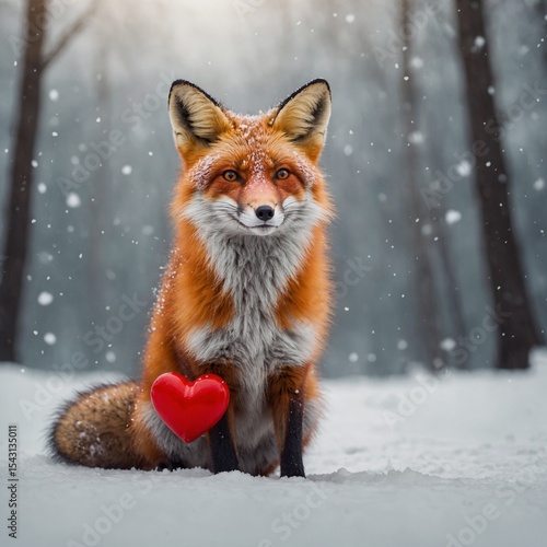 Cute happy cartoon fox holding red heart vector Illustration on a winter background. Saint Valentines love greeting card with copy space
