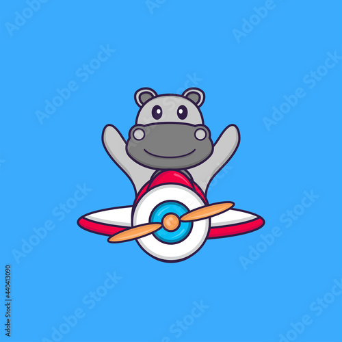 Cute hippopotamus flying on a plane. Animal cartoon concept isolated. Can used for t-shirt, greeting card, invitation card or mascot. Flat Cartoon Style