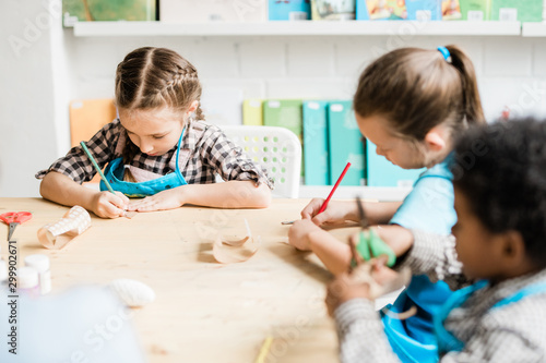 Cute intercultural schoolkids sitting by table and drawing halloween symbols