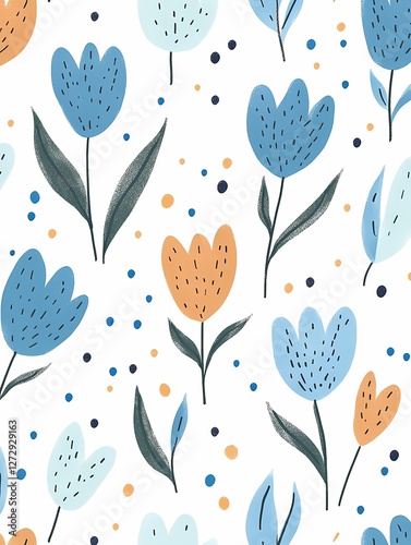 Cute Japanese-Inspired Blue Tulip Pattern with Dots on White