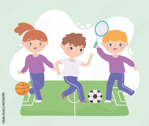 sport, children, boy, girl, cute, soccer, basketball, tennis, happy, childhood, children, fun, children, youth, young, cheerful, leisure, happiness, joy, active, play, girl, smile, group, little, exercise, ball, vector, illustration, design
