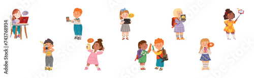 Cute Kids with Modern Gadget and Mobile Device Vector Set
