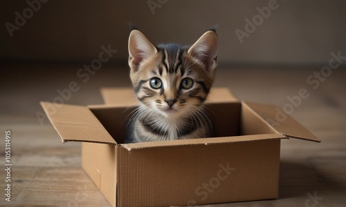 kitten, cat, pet, animal, domestic, felino, cute, cardboard box, playful, curious, eye, expression, indoor, cosy, adorable, young, fluffy, whisker, exploration, comfort, companionship, charming, innocent, fun