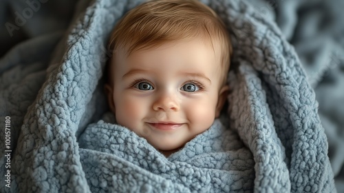 Cute little baby boy wrapped up in a soft comfortable blanket, young male newborn child