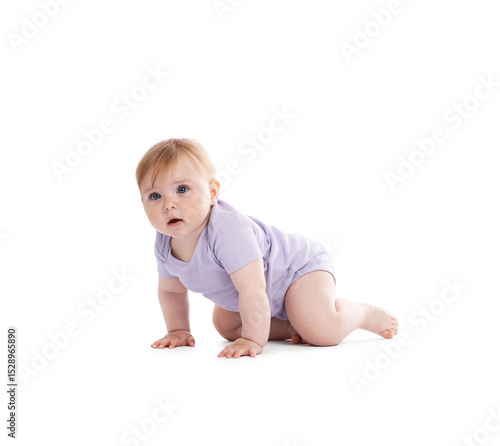Cute little baby crawling on white background