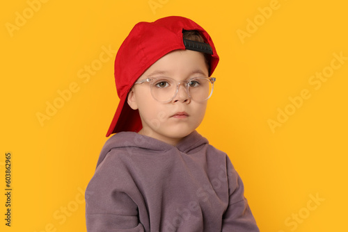 Cute little boy in glasses on orange background