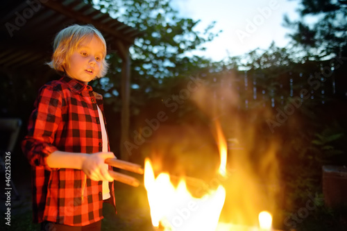 Cute little boy is burning a bonfire on a summer evening in the backyard. Child puts firewood in a fire bowl by tongs. Summer holidays in countryside.