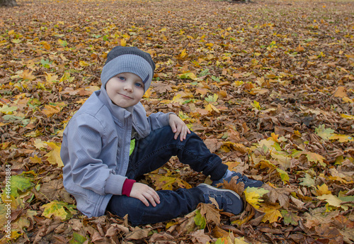 boy, autumn, smiling, fall leaf, sitting, cute, innocence, city park, happiness, playful, joy, son, children, childhood, looking, colourful, positive, yellow, orange, expression
