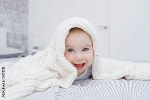 Cute little caucasian baby playing hiding under white knitted blanket at home in light interior. Kid games, having fun indoors and winter cold idea