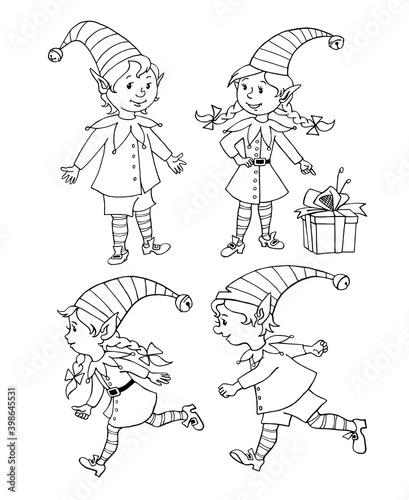 Cute little Christmas Elves girl and boy. Vector hand drawn black outline Cartoon characters. Simple illustration for New year and xmas design, greeting cards, calendars, prints, coloring book