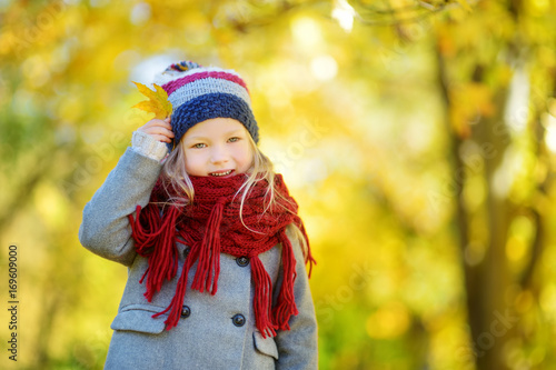 Cute little girl having fun on beautiful autumn day. Happy child playing in autumn park. Kid gathering yellow fall foliage.