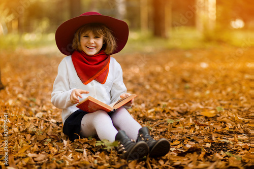 Cute little girl in red hat sitting on fall leaves and reading interesting book in autumn park