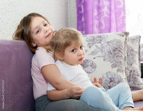 2, sofa, happy, home, fun, female, children, girl, friendship, friends, cute, children, children, sister, childhood, sitting, little, smiling, girl, young, caucasian, cheerful, sister, leisure, casual attire, children, indoor, living, room, funny