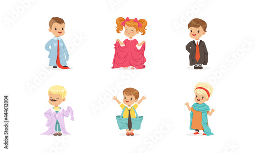 Cute Little Kids Wearing Elegant Adult Oversized Clothing Vector Set