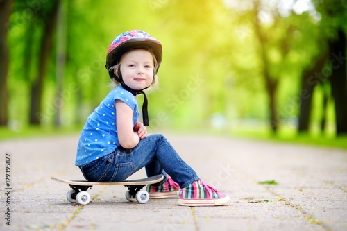 Cute little preteen girl wearing helmet sitting on a skateboard