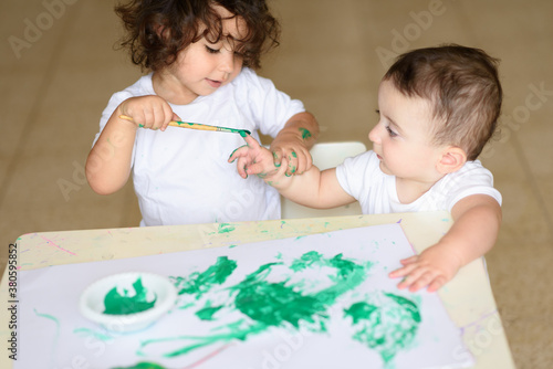 Cute little toddler girl and baby boy drawing with green watercolor paint and brush on hands. Curly adorable child , brunette kids painting at table.