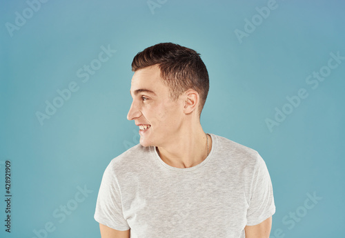 Cute man holds his hand behind his head emotions blue background white t-shirt