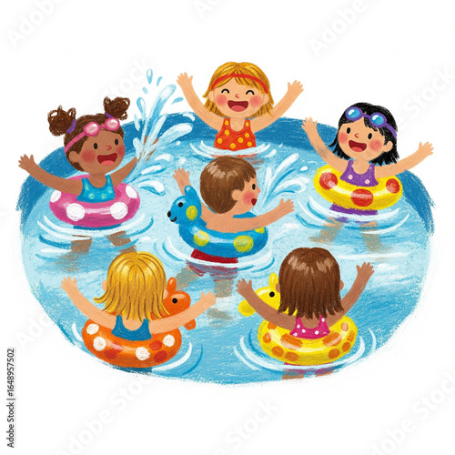 Cute oil pastel crayon style illustration of happy children swimming in a small pool, seen from a side angle, some splashing water and some wearing swim rings