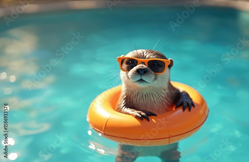 Cute otter wears sunglasses, floats on orange ring in swimming pool. Playful mammal enjoys summer sun, water. Relaxed animal floats peacefully. Bright sunshine, vibrant water. Relaxing leisure