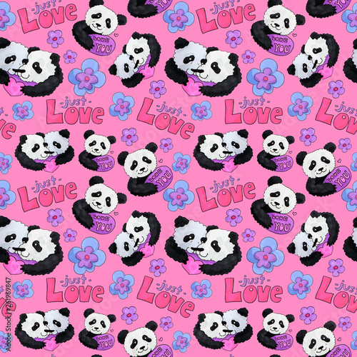 pink, purple, flower, valentine, cartoon, art, design, pattern, panda, marker, illustration, nature, background, love, animal, drawing, wild, bear, colours, decoration, white, hand, painting, seamless, print, children