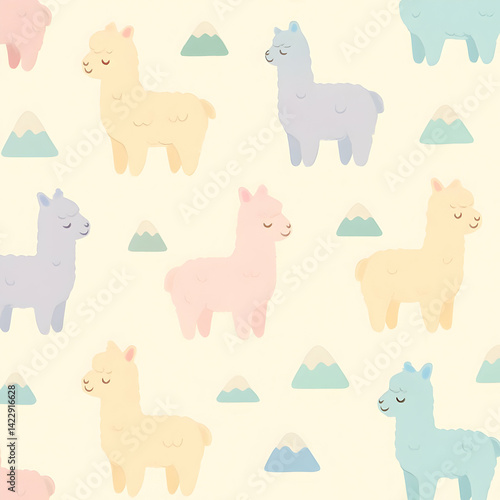 Cute pastel alpacas in a seamless pattern on mountain hills minimal kawaii design for nature lovers