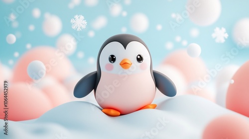 penguin, cartoon, character, cute, adorable, snow, winter, cold, ice, arctic, antarctica, animal, bird, wildlife, nature, glacé, frosty, landscape, season, snowy, white, black, illustration, three-dimensional, digital, art, graphic, design, happy, cheerful, fun, holiday, christmas, new year, celebration, greeting, card, background, render, digital artwork, abstract, soft, fluffy, smooth, smoothness, snowflake, ball