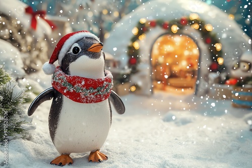 Cute penguin in Santa hat and scarf standing in snow with festive decorated igloo in background, snowflakes falling.