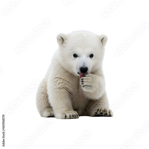 Cute polar bear cub standing isolated on white background for wildlife and arctic concept